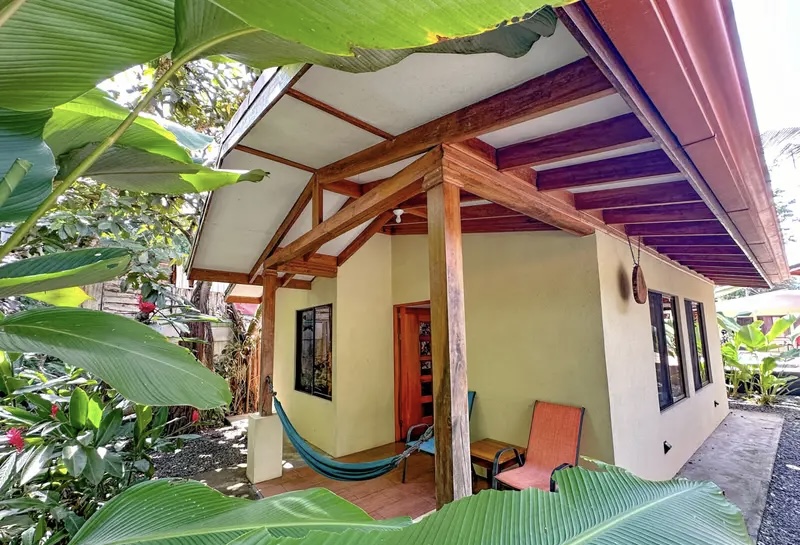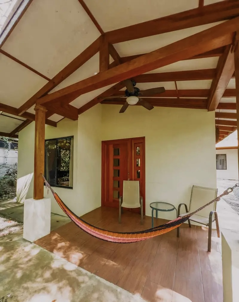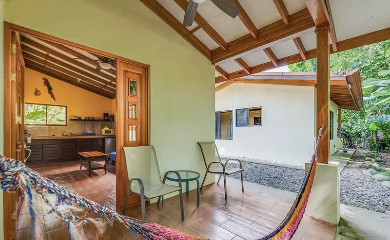 •Covered patio with hammock and lush greenery